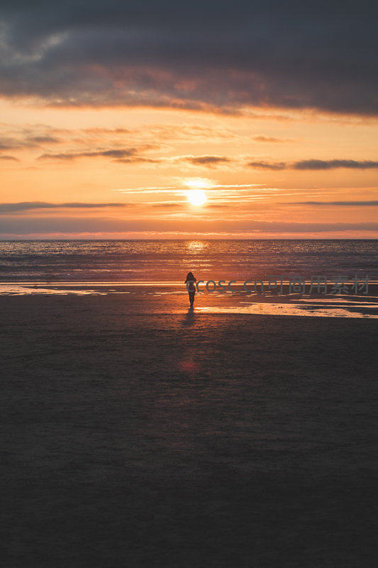 金色的夕阳缓缓沉入海平面,将天空染成绚烂的橙红色,一个孤独的身影在湿润的沙滩上漫步,倒影随波光摇曳。