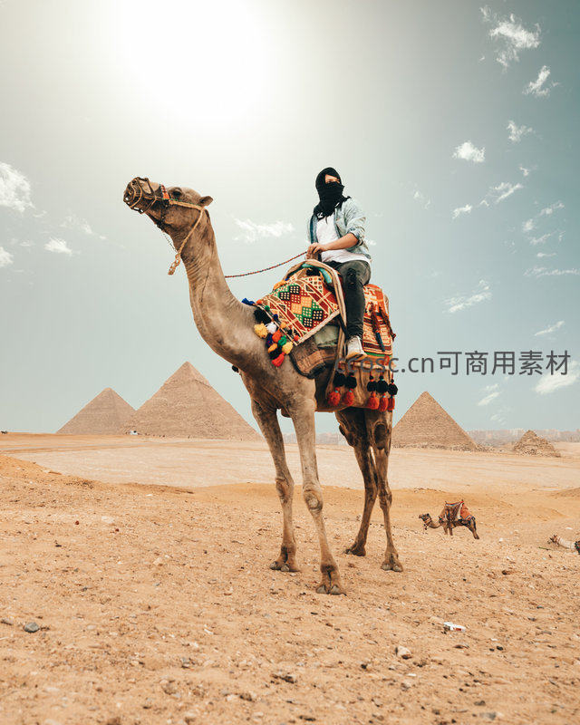 一名游客头戴面罩,骑在装饰华丽的骆驼上,背景是雄伟的吉萨金字塔群,在晴朗的天空下展现出浓厚的异域风情与历史感。