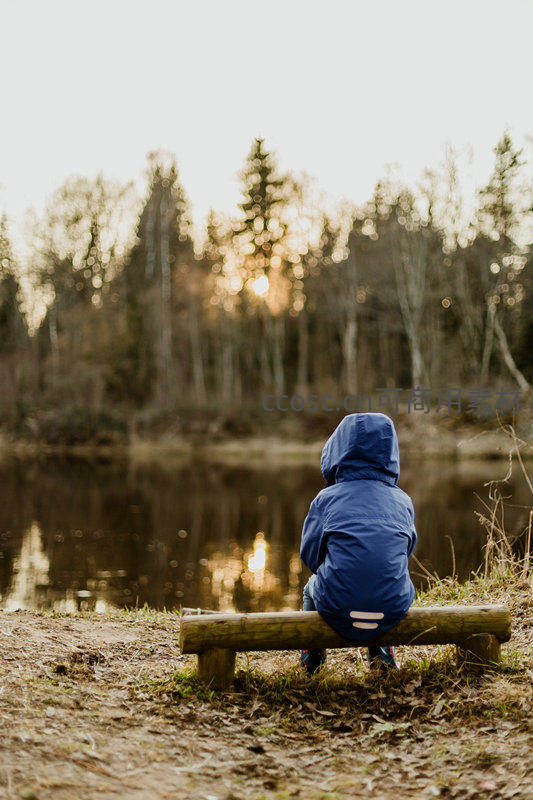 蓝衣孩童静坐湖畔,远眺林间夕阳余晖