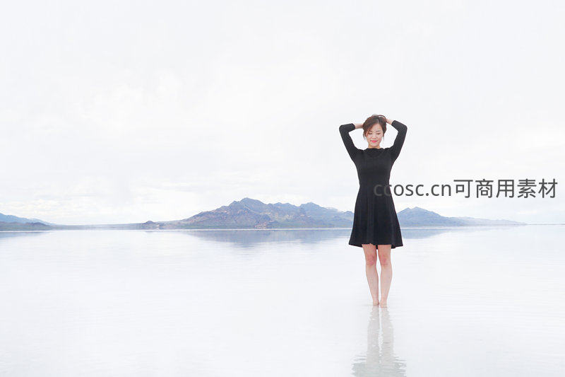 一名身着黑色连衣裙的女子独自站立在平静如镜的湖面上,身后是连绵的山脉和广阔的天空,营造出空灵、纯净的视觉效果。