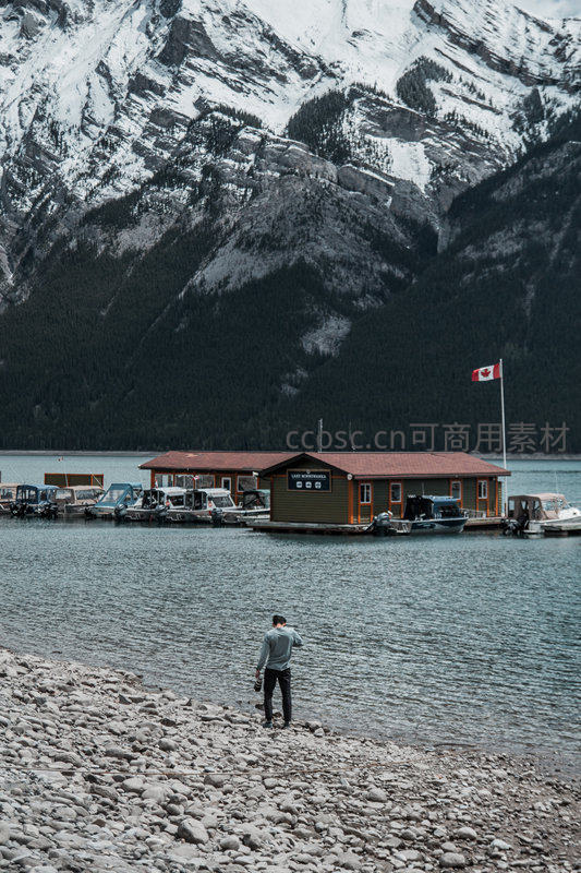 一位游客站在布满石子的湖岸边,仰望着远处白雪皑皑的巍峨山脉和湖面上的浮动码头,加拿大国旗在风中飘扬,景色壮丽迷人。