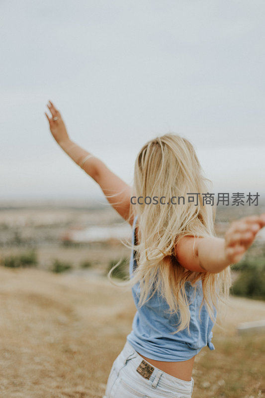 金发女子站在山顶,迎着微风张开双臂,俯瞰远方朦胧的城市景观,感受大自然带来的宁静与心灵的释放。
