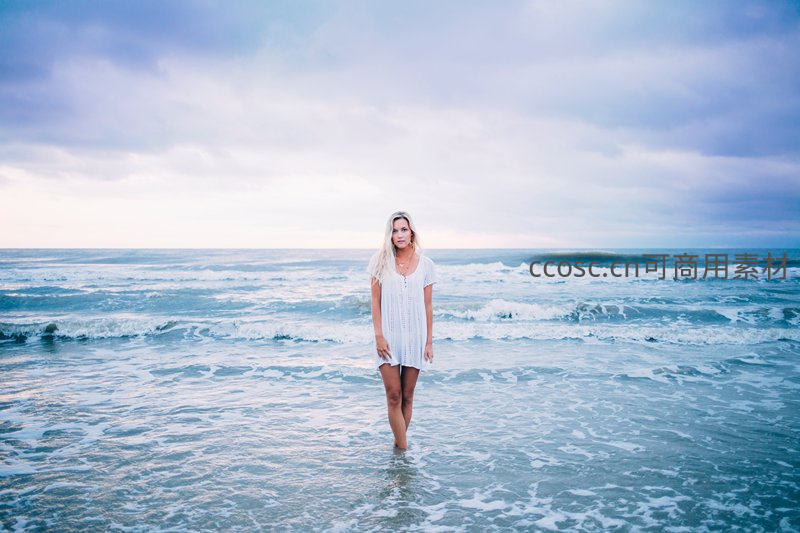 金发少女身穿白色镂空连衣裙,赤足站在微凉海水中,身后是翻涌的浪花与温柔暮色,画面纯净如诗。