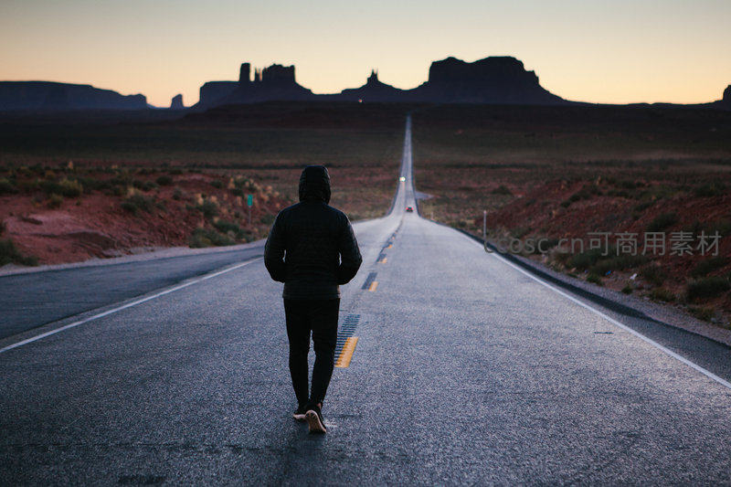 一人背对镜头走在笔直延伸的公路上,远方是壮丽的岩石山脉轮廓,夕阳余晖洒满大地,传递出旅途中的孤独与自由感。