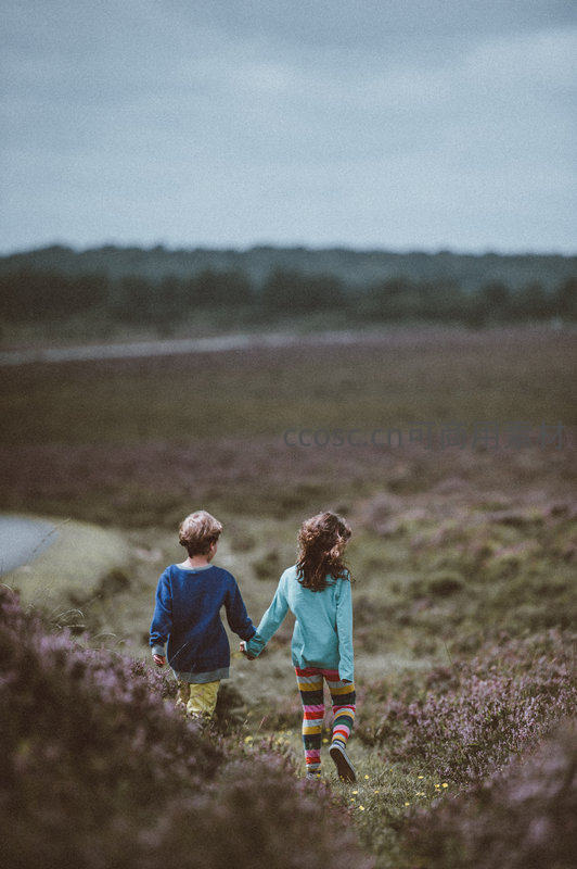 两个孩子手牵着手,背对镜头走在开满紫色花朵的田野小径上,远处是朦胧的树林和天空,画面充满童真与探索自然的温馨感。