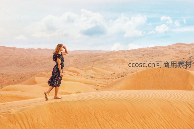 女子身着花裙行走在广袤沙丘之上,蓝天白云映衬无垠黄沙,尽显荒野壮美与旅行者的自由心境,令人向往远方。