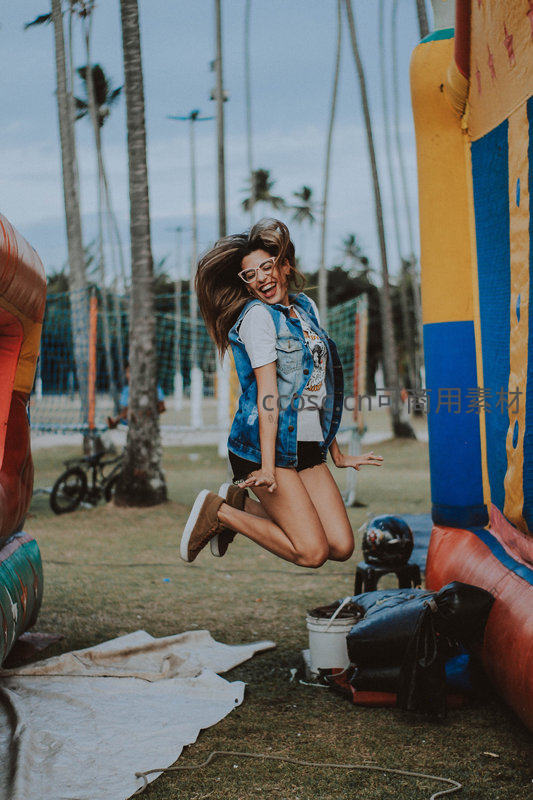 一位年轻女孩在户外草地上,于彩色充气城堡旁开心地腾空跳跃,背景是高大的棕榈树和晴朗天空,充满活力与童趣。