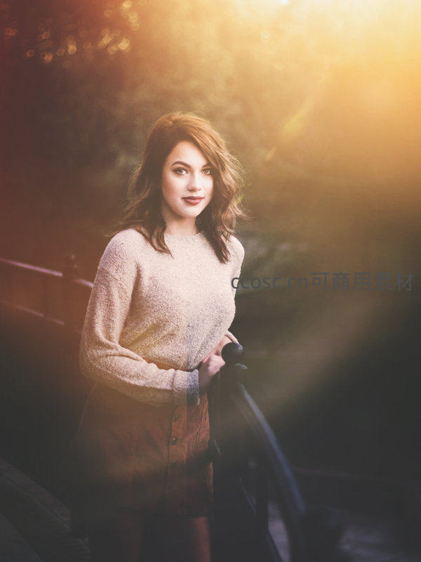 一位女子站在桥边,金色阳光从背后洒下形成唯美光晕,她身穿毛衣静静回望镜头,氛围宁静而温暖,充满电影感。