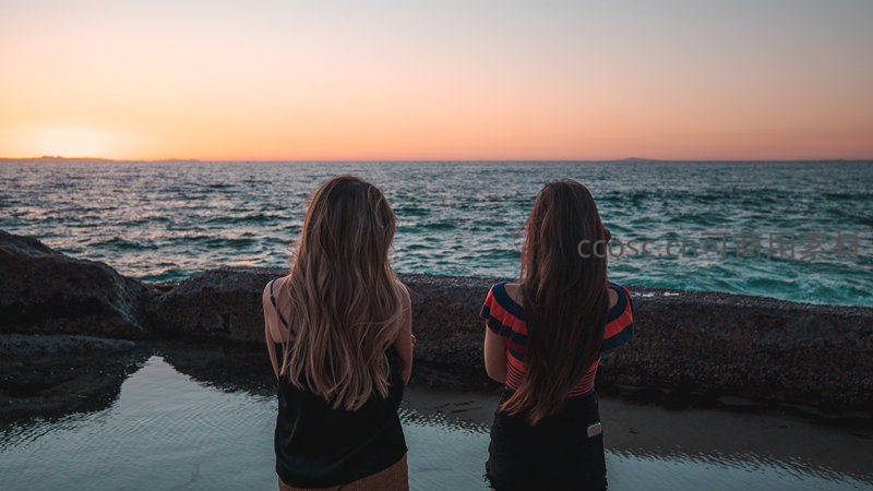 两位女孩并肩坐在岩石上,静静观赏海平面上的绚丽日落,海水轻拍岸边,画面温馨而富有诗意。