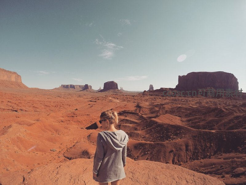 一位游客站在红色砂岩峡谷边缘,远眺层叠的孤峰与沟壑,阳光洒满大地,尽显大自然鬼斧神工的壮美。