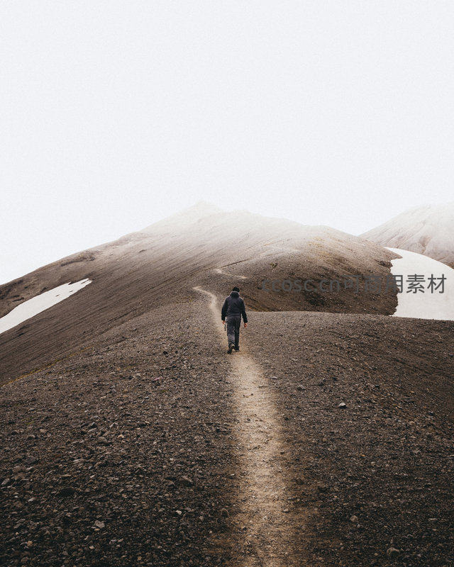 一人背影行走在荒芜的山脊小径上,远处山峦覆雪,天空灰白,画面充满孤寂与探索的意境,展现人与自然的对话。