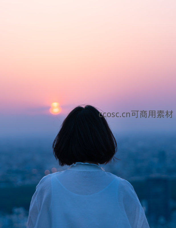 女子静观城市日落余晖