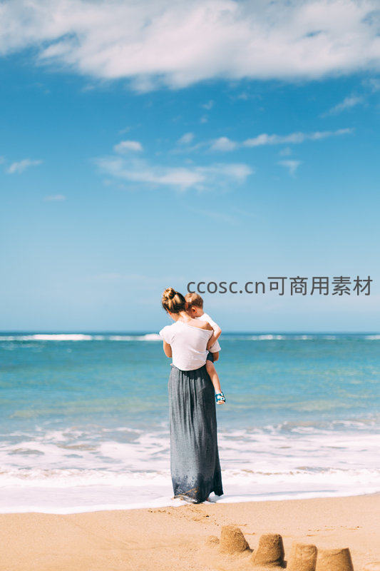 一位母亲抱着孩子站在海边,背对镜头眺望蔚蓝大海,脚下是柔软的沙滩和孩子们堆砌的沙堡,画面充满宁静与温馨的家庭氛围。