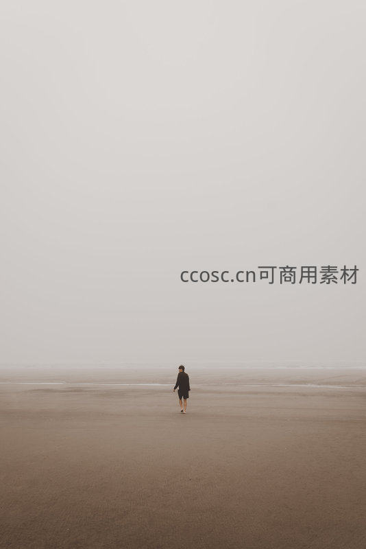 一人独自走在被浓雾笼罩的空旷沙滩上,天地一片灰白,身影渺小而坚定,传递出静谧、沉思与与世隔绝的意境。