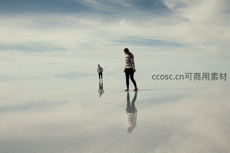 在广阔无垠的盐湖之上,水面如镜,完美倒映着天空与行人。两人相隔而立,营造出一种宁静又略带疏离的氛围,仿佛置身于天地之间。