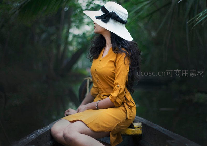 一位身着黄色连衣裙、头戴白色宽檐帽的女士,静坐于林间小舟之上,长发飘逸,背景是朦胧的热带植物,氛围宁静而优雅。
