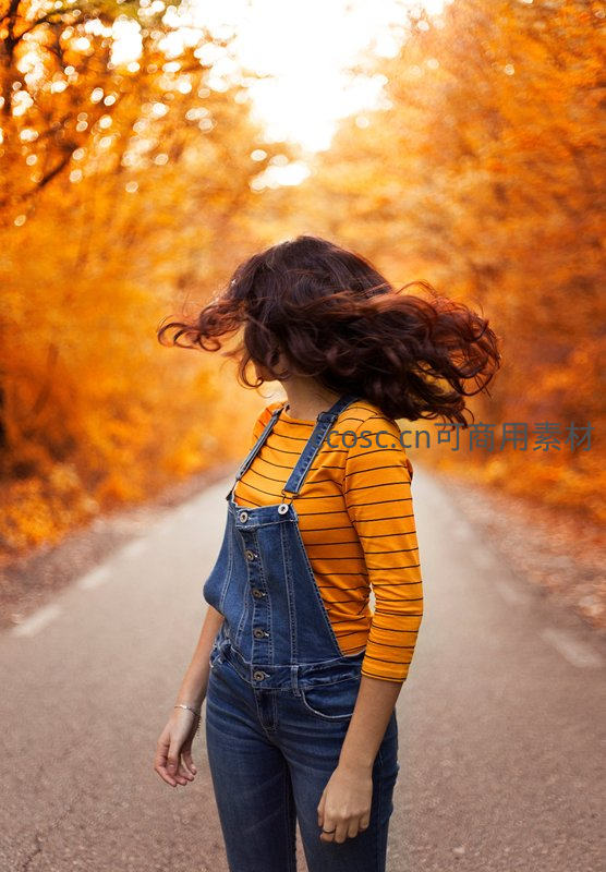 秋日公路边飞扬卷发的少女