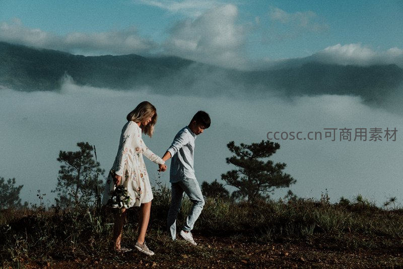 一对情侣手牵手漫步在云雾缭绕的山顶,远处群山若隐若现,近处松树挺立,营造出如梦似幻的浪漫氛围。