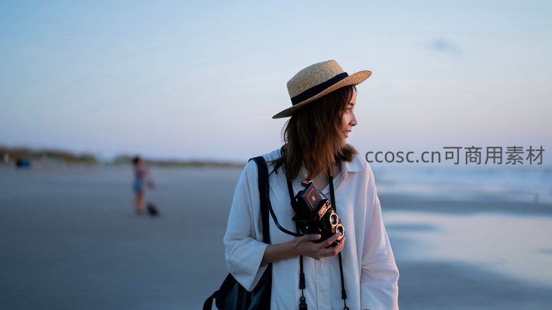 黄昏时分,一位戴着草帽的女摄影师站在沙滩上,手持复古胶片相机,目光投向远方海平线,充满诗意与宁静。