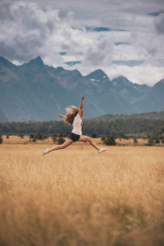 少女在金色麦田腾空跃起,远山为背景尽显活力