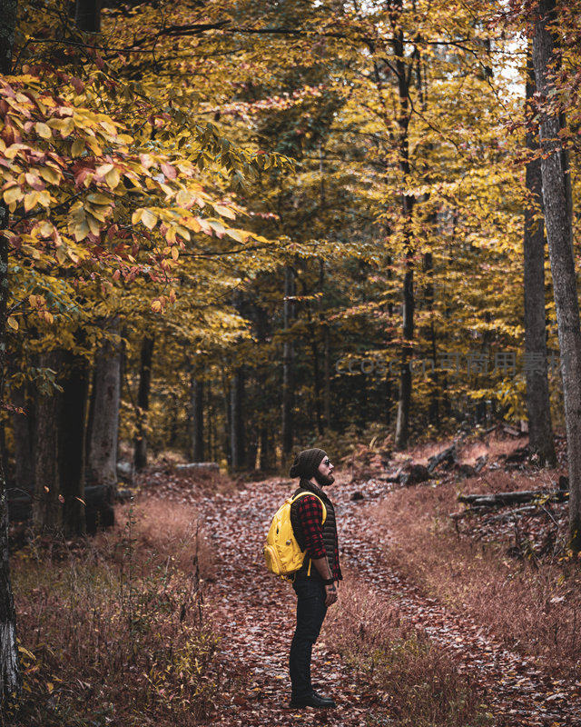 秋林漫步,黄背包客仰望斑斓树冠