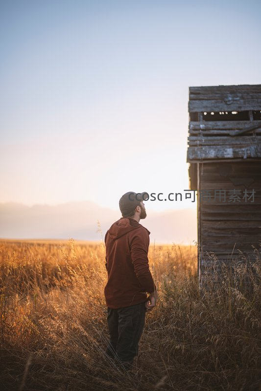 一位男子站在金黄的田野中,背对镜头凝望远方的落日,身旁是斑驳的旧木屋,整个画面充满宁静与怀旧的气息。