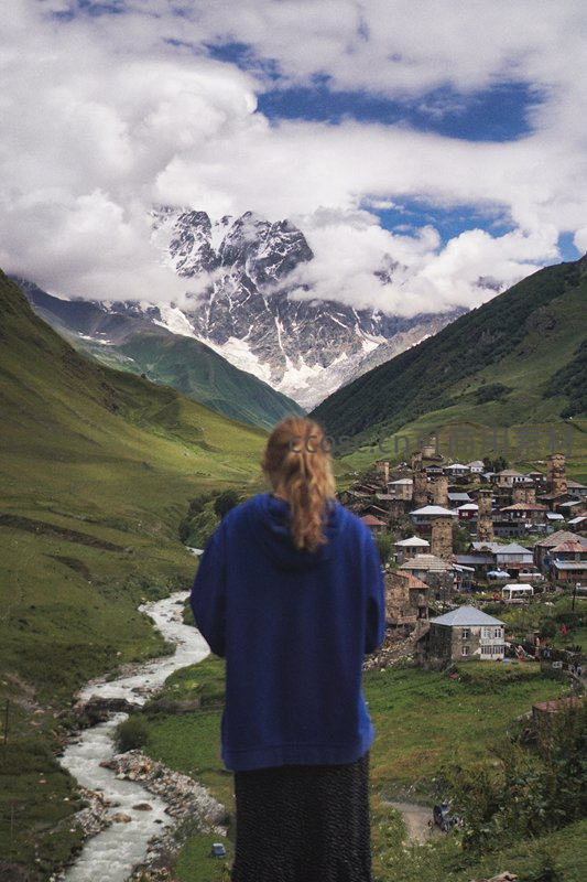 一位女子背对镜头站立,俯瞰绿意盎然的山谷和散落其间的古朴村落,远处雄伟雪山被云海环绕,构成一幅壮阔的高原画卷。