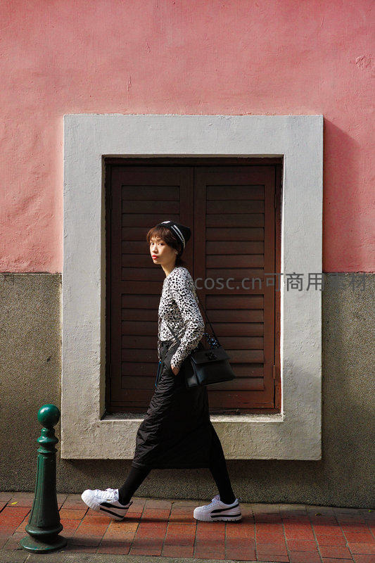 一位年轻女孩身着豹纹上衣与黑色长裤,脚踩白色运动鞋,斜挎黑色手袋,行走在粉色墙壁与深色百叶窗前,展现现代街头的活力与个性。