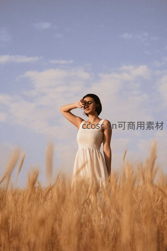 女子身穿白色连衣裙伫立在金黄麦浪中,抬手遮阳凝望远方,背景是澄澈蓝天与朵朵白云,画面充满温暖与自由的夏日气息。