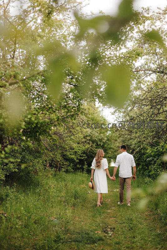 一对情侣手牵着手漫步在绿意盎然的林间小道上,前景树叶虚化形成天然画框,女方提草帽、男方着白衫,画面清新自然,洋溢爱意与宁静。
