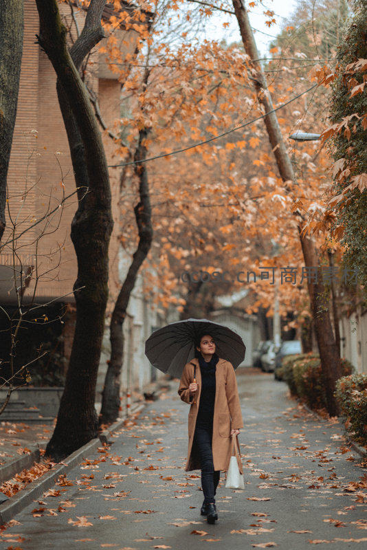 金黄落叶铺满小径,一位女子撑着黑伞缓步前行,两旁树木与建筑构成诗意街景,展现秋日都市的浪漫与闲适。