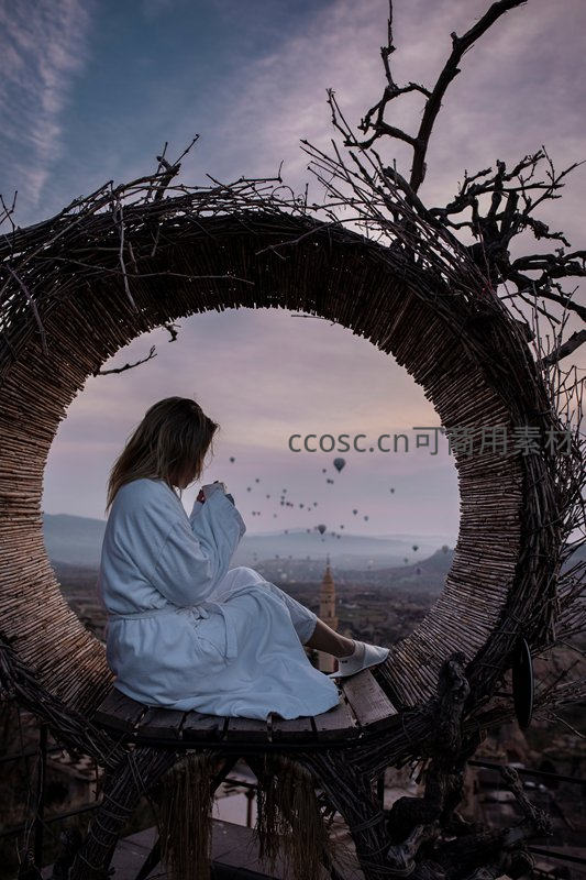女子坐在独特的藤编圆形座椅上,静静凝望远方山谷中缓缓升起的众多热气球,晨曦微光映衬下,景象壮丽而安详。