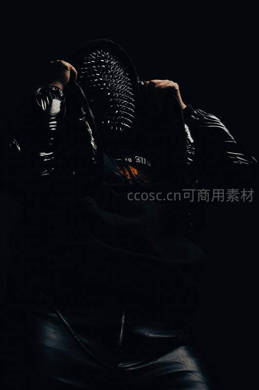 黑暗中拉起连帽衫,露出尖刺面具的神秘身影