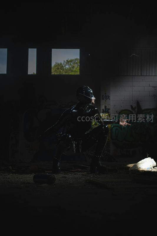 在布满涂鸦的废弃厂房内,一位身着黑色亮面紧身衣的人物呈低蹲姿态,聚光灯勾勒其轮廓,散发冷峻而充满力量的街头美学气息。