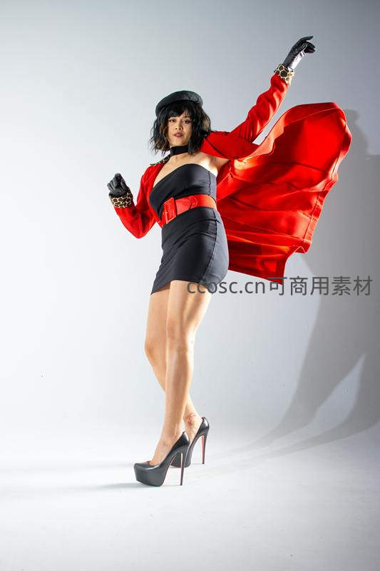 一位身着黑色短裙与鲜红飘逸外套的女性,脚踩超高跟鞋,摆出充满动感的姿势,红色衣袂飞扬,尽显飒爽英姿与时尚魅力。