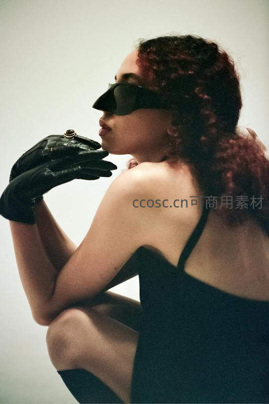卷曲红发女子侧身而坐,佩戴夸张墨镜与黑色皮质手套,手托下巴凝视远方,散发出冷艳、独立与高级时尚的独特气质。