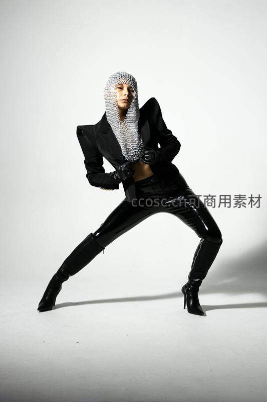一位身着黑色皮质套装、头戴银色链甲头罩的女性,在纯白背景下摆出充满力量感的战斗姿势,展现前卫与力量结合的独特风格。