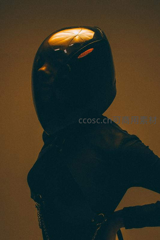 一位身着黑色紧身装束的人物,在昏黄背景中侧身而立,头盔内部散发温暖光晕,营造出强烈的未来科技与神秘氛围。