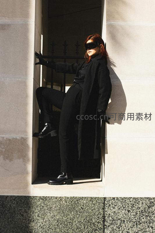 阳光洒在石墙之上,身着全黑套装的女子倚靠在门框边,墨镜遮面,姿态自信洒脱,尽显都市摩登与力量美感。