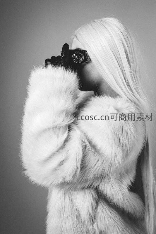 黑白影像中,长发女子裹着蓬松毛绒外套,手持复古相机,姿态优雅而神秘,营造出经典电影般的艺术氛围和视觉张力。