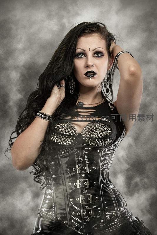 黑白色调中,长发女子身着带铆钉的束腰上衣,浓重眼妆与唇妆突出个性,一手抚发,眼神迷离,营造出神秘又性感的氛围。