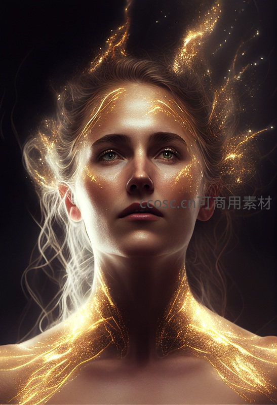 一位女性被流动的金色能量环绕,从额头延伸至肩颈,眼神深邃,仿佛拥有掌控自然元素的神秘力量。