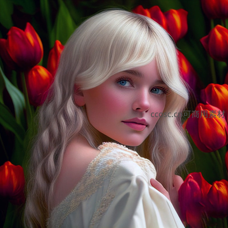 金发碧眼的少女置身于一片盛开的红色郁金香花海中,她微微侧首回眸,眼神清澈温柔,洁白蕾丝衣袖在绿叶与红花映衬下更显纯真烂漫。