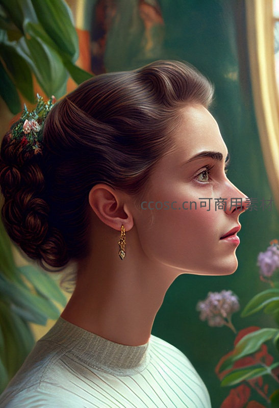 一位梳着精致发髻、佩戴金色耳坠的女子侧脸凝望远方,背景绿植环绕,光线柔和,营造出静谧而富有诗意的古典氛围。