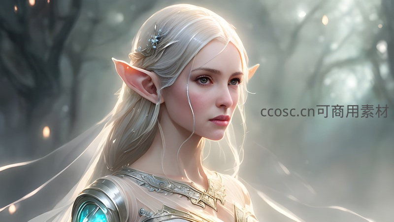 一位拥有银白色长发与尖耳朵的精灵少女,身披轻盈铠甲,伫立在薄雾弥漫的古老森林中,眼神宁静而深邃,仿佛在守护着自然的秘密。