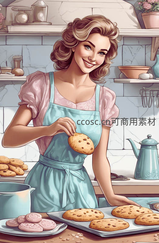 一位穿着蓝色围裙的女士在明亮的厨房中微笑着展示刚烤好的巧克力曲奇,周围摆放着各式甜点,氛围温暖而治愈。