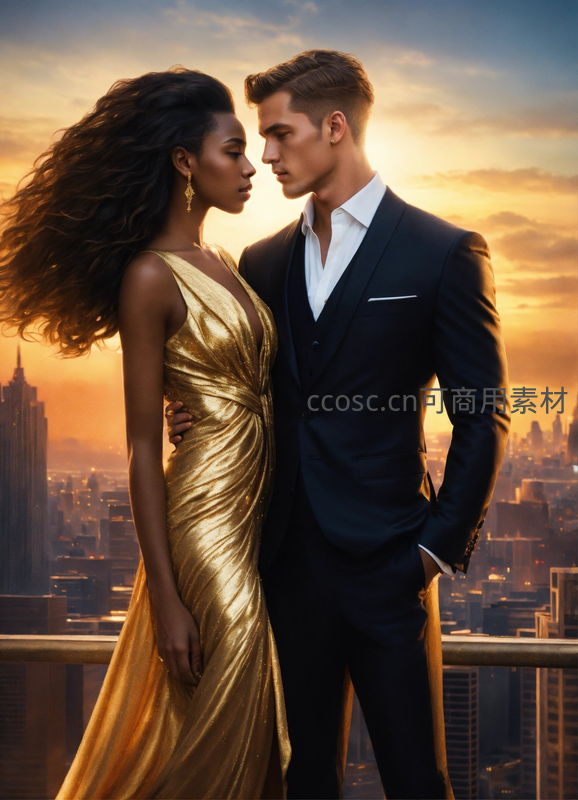 一对俊男靓女在夕阳笼罩的城市天台深情相望,金色晚礼服与黑色西装形成视觉焦点,背景是辉煌的都市剪影。