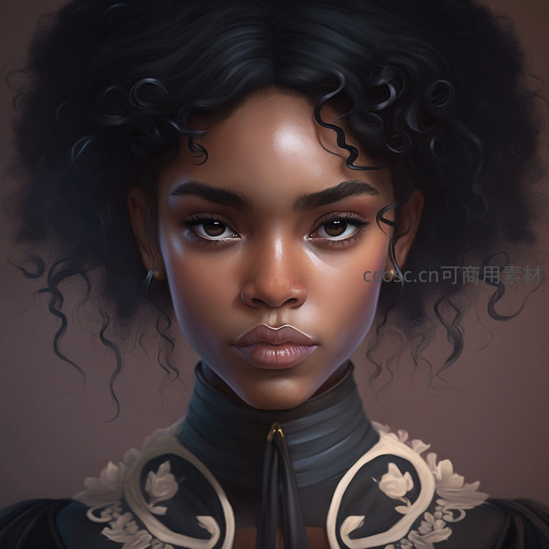 黑发卷曲的少女身着复古高领服饰,衣领点缀白色花卉图案,神情宁静,光影柔和,营造出古典而优雅的艺术氛围。