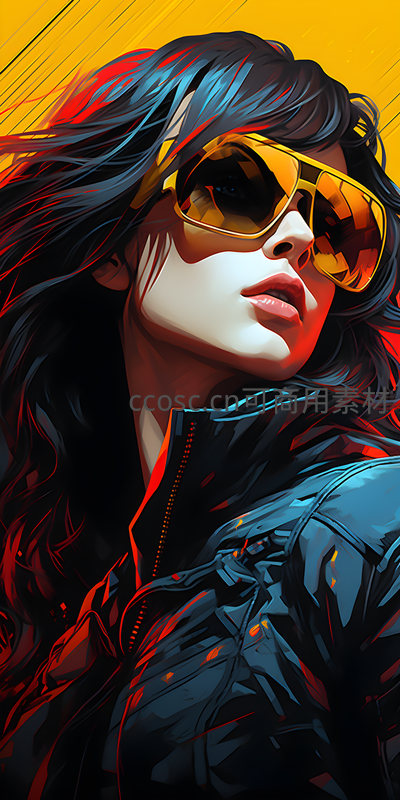 动感线条与霓虹色彩交织,一位戴着黄色墨镜、身穿黑色皮夹克的女郎侧脸凝视,散发现代都市的酷炫与艺术张力。