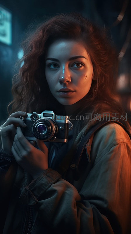 红蓝冷暖光交织的夜晚,卷发女子手握复古胶片相机,脸上泪珠闪烁,眼神忧郁而专注,仿佛捕捉着城市深处的故事。